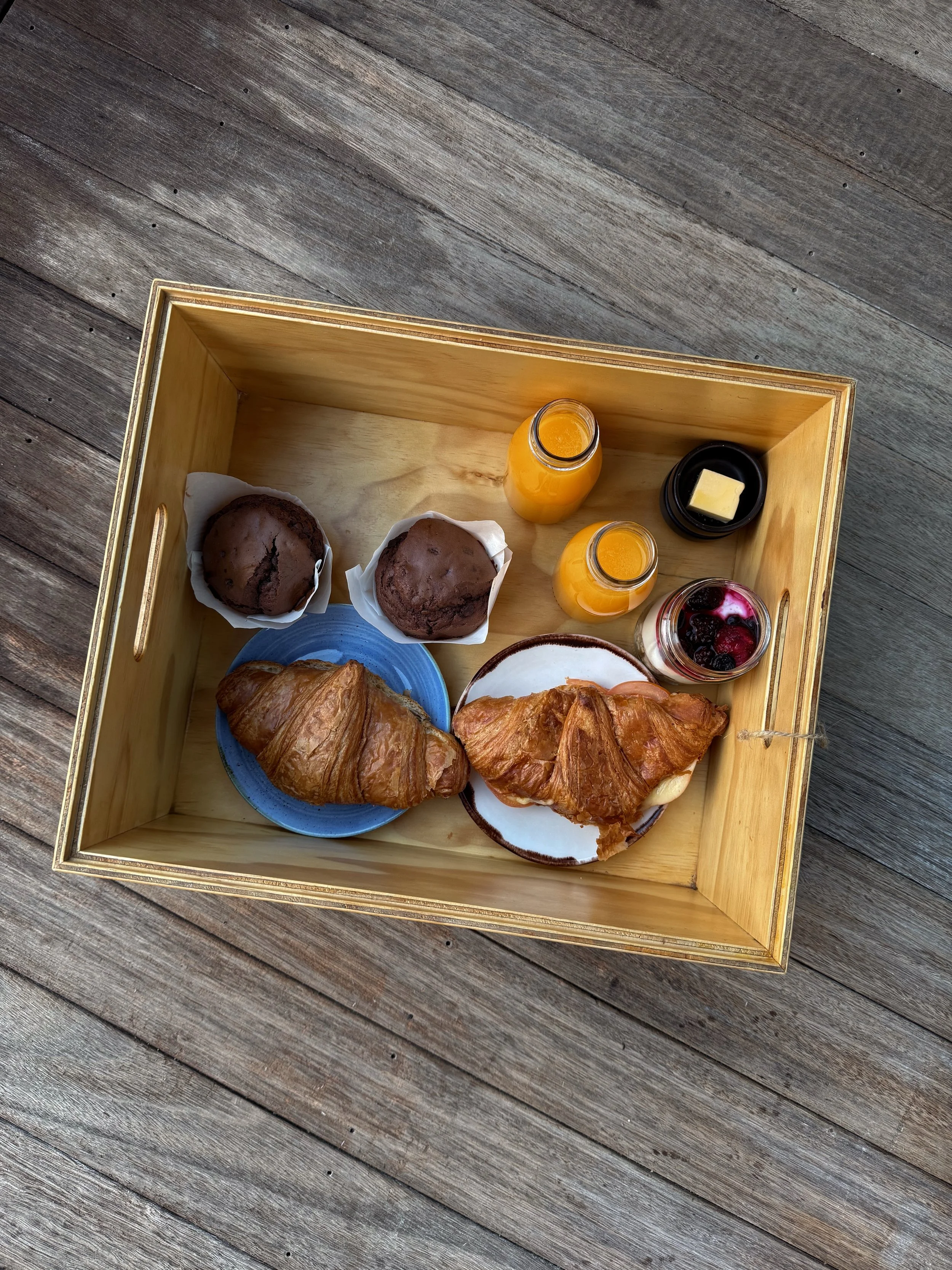 The Lodge offered a service where you pop in your breakfast menu for the next day, and it turns up at your doorstep in the hands of their friendly staff. You then simply leave the empty box outside your door, and they collect it mid morning, while resetting the bed and giving the room a quick little spruce. We opted for fresh croissants, muffins, juice, and muesli - A+.